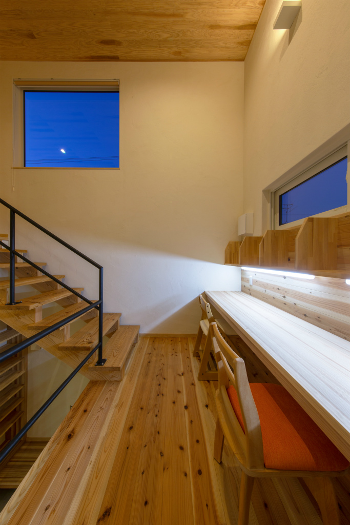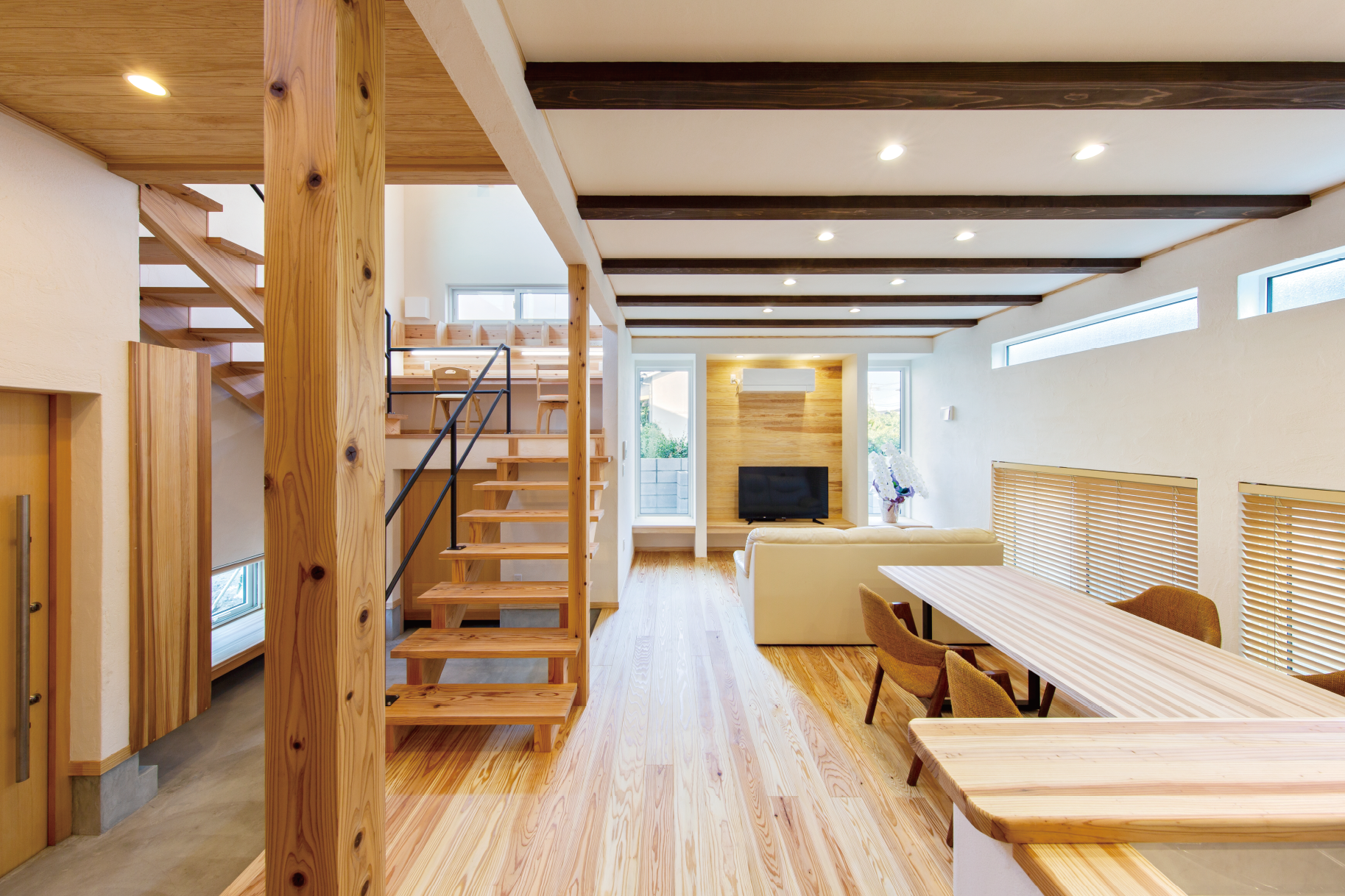 明るく開放感あるスキップフロアには、杉材で大きなカウンターを造作。