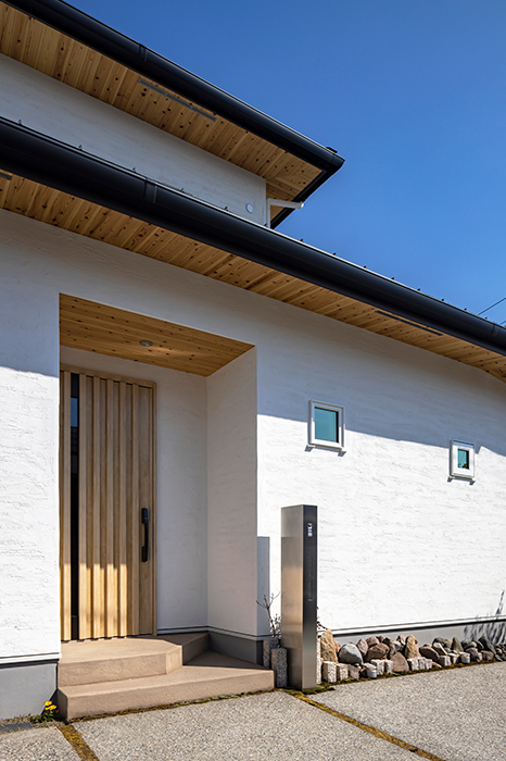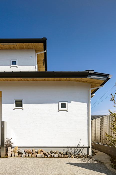 白の漆喰壁と杉の軒天のコントラストが美しい、モダンな外観の家。