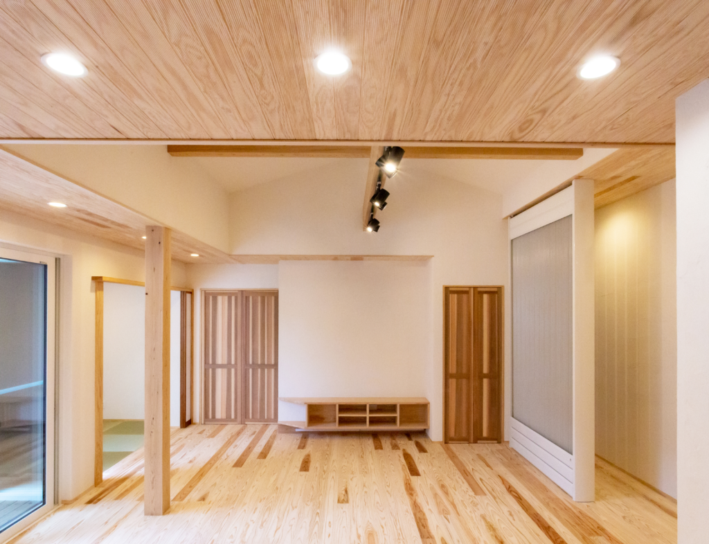 インテリアは漆喰や杉の無垢床など、自然素材をふんだんに使用。
